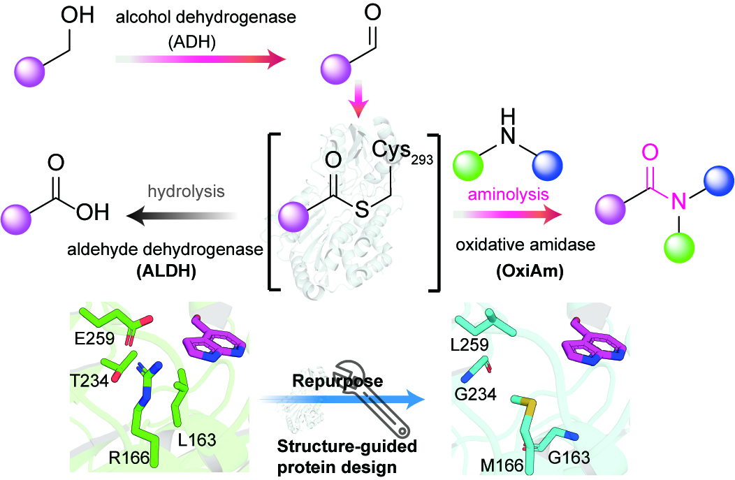 醛脱氢酶(aldehyde dehydrogenase, ALDH)是自然界中广泛存在的、以NAD(P)+为辅因子的氧化酶,其可以将结构多样的醛转化为羧酸,在生命体能量和物质代谢中扮演重要角色。在其催化过程中,活性半胱氨酸首先与醛形成硫代半缩醛结构,随后被辅因子氧化生成硫酯中间体,最后再在被水分子水解成羧酸。研究团队基于对于酶学机制的深刻理解,通过对恶臭假单胞菌来源的对羟基苯甲醛脱氢酶PHBDD的理性改造,使得硫酯中间体不再被水解,而是特异性与胺发生氨解反应生成酰胺,成功将PHBDD转化为可直接催化醛与胺生成酰胺的氧化酰胺化酶(OxiAm)。该氧化酰胺化酶不仅具有非常良好的底物宽泛性和催化效率,还可以突破酰胺化合物原有的合成逻辑,大大提高了酰胺类药物的合成效率,具有良好的工业应用价值。此外,该新颖酶催化工具还可以和醇脱氢酶以及NADP氧化酶相耦合,该酶促级联反应体系可以从氧化态更低的醇出发、以廉价易得的氧气为氧化剂一步合成酰胺化合物。更重要的是,研究团队还发现该蛋白改造策略具有良好的普适性,其他不同来源的ALDH在引入相同突变后可均催化醛和胺反应产生酰胺,为酰胺键的酶法构建开辟了全新方向。