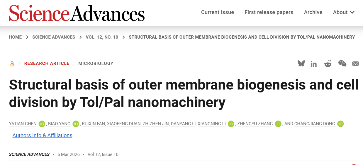 Sci. Adv. | 武汉大学董长江/张郑宇团队解析Tol/Pal纳米机器结构,揭示细菌外膜发生的能量传递奥秘